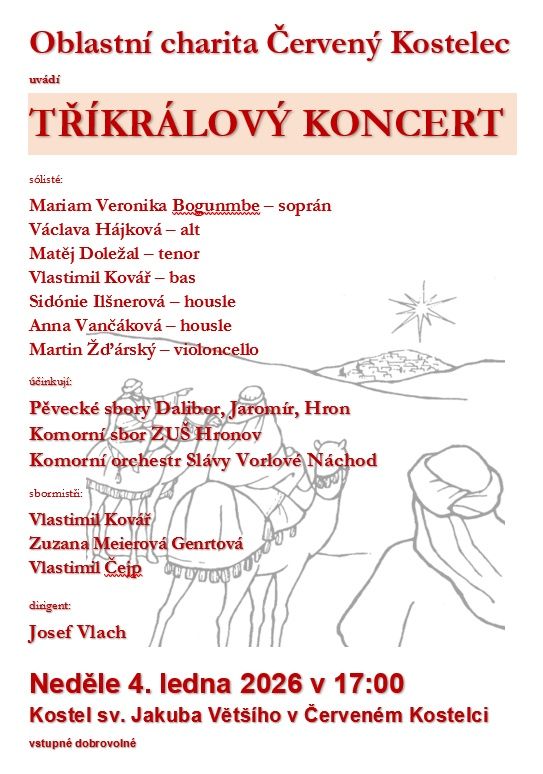 Poslední v sérii se uskutečnil stejný koncert 4. ledna nového roku 2026, a to v Chrámu svatého Jakuba většího v Červeném Kostelci. My jsme opět nastoupili až na druhou část, mezitím jsme byli místními farníky pohoštěni na faře, čehož jsme si velmi cenili, protože na faře bylo teplo. Kostel je totiž velmi studený. Návštěvnost byla veliká.